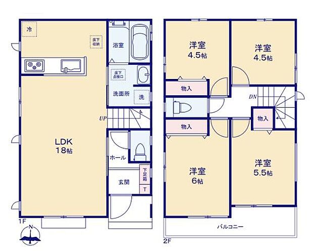 間取り内訳:リビングダイニングキッチン 18帖(1階)・洋室 6帖(2階)・洋室 5.5帖(2階)・洋室 4.5帖(2階)・洋室 4.5帖(2階)