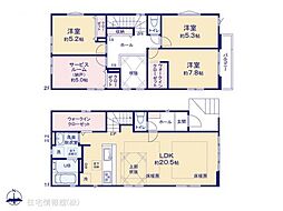 | 間取り | 4LDK 間取り内訳:洋室 5帖(2階)x2・リビングダイニングキッチン 19帖(1階)・洋室 8帖(2階)・洋室 5.3帖(2階) |