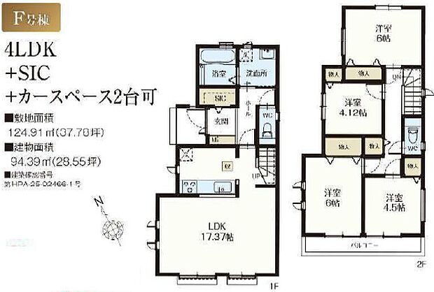 | 間取り | 4LDK 間取り内訳:リビングダイニングキッチン 17.3帖(1階)・洋室 6帖(2階)x2・洋室 4.5帖(2階)・洋室 4.1帖(2階) |