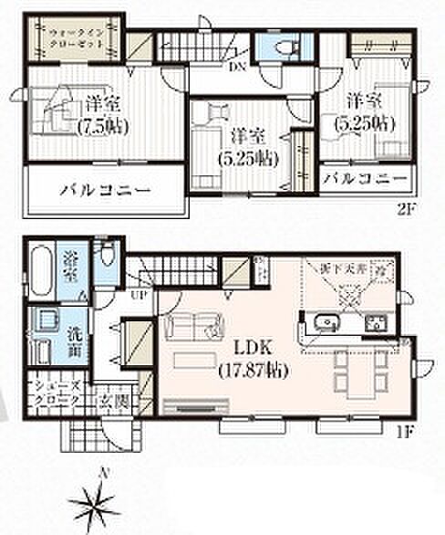 間取り内訳:リビングダイニングキッチン 17.8帖(1階)・洋室 7.5帖(2階)・洋室 5.2帖(2階)x2