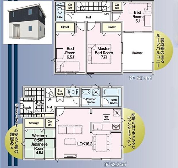 | 間取り | 4LDK 間取り内訳:リビングダイニングキッチン 16.2帖(1階)・和室 4.5畳(1階)・洋室 5帖(2階)・洋室 7.7帖(2階)・洋室 6.5帖(2階) |