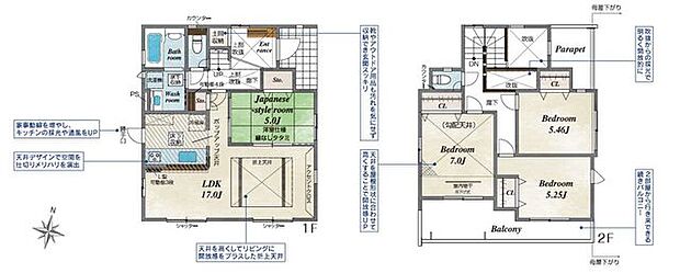 ■南東角地のため解放感あり■カースペース2台分駐車可能(車種による)■玄関上部吹き抜け、土間収納付■畳スペースあり■省エネ給湯器、エコジョーズ搭載