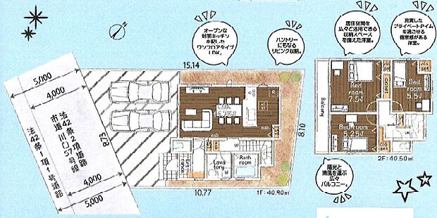 | 間取り | 3LDK 間取り内訳:リビングダイニングキッチン 14.7帖(1階)・洋室 7.5帖(2階)・洋室 5.5帖(2階)・洋室 5.2帖(2階) |