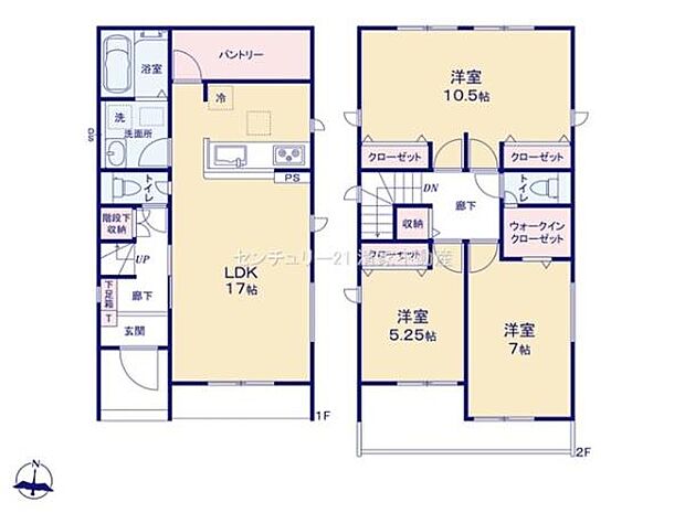 間取り内訳:リビングダイニングキッチン 17帖(1階)・洋室 10.5帖(2階)・洋室 7帖(2階)・洋室 5.2帖(2階)