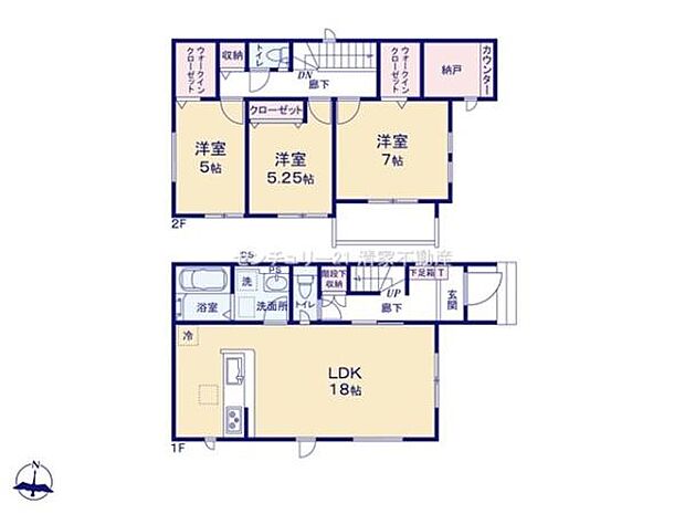 間取り内訳:リビングダイニングキッチン 18帖(1階)・洋室 7帖(2階)・洋室 5.2帖(2階)・洋室 5帖(2階)