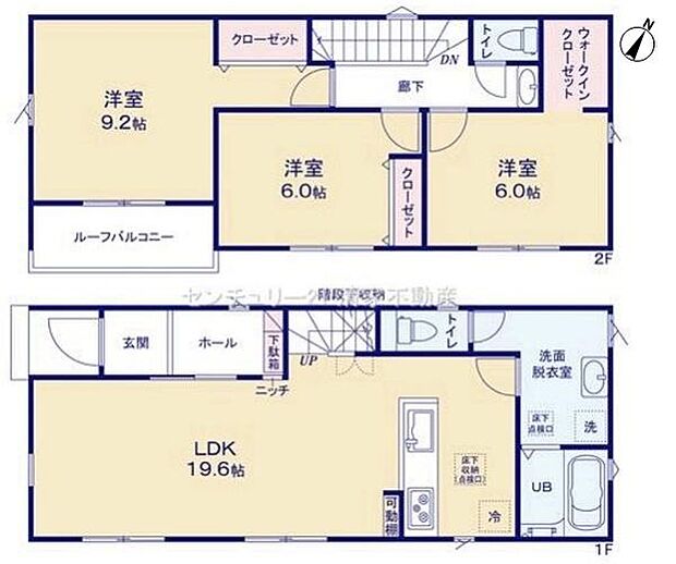 | 間取り | 3LDK 間取り内訳:リビングダイニングキッチン 19.6帖(1階)・洋室 9.2帖(2階)・洋室 6帖(2階)・洋室 6帖(2階) |