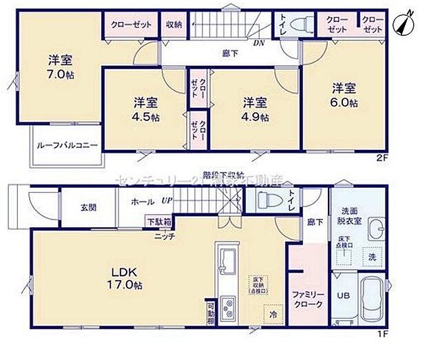 | 間取り | 4LDK 間取り内訳:リビングダイニングキッチン 17帖(1階)・洋室 7帖(2階)・洋室 6帖(2階)・洋室 4.9帖(2階)・洋室 4.5帖(2階) |
