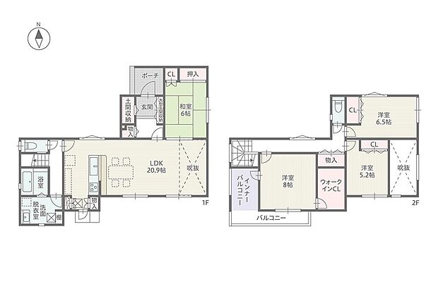 | 間取り | 4LDK 間取り内訳:リビングダイニングキッチン 20.9帖(1階)・和室 6畳(1階)・洋室 8帖(2階)・洋室 6.5帖(2階)・洋室 5.2帖(2階) |