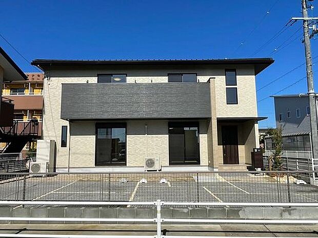 • 【【B棟 外観】】周辺の街並みと調和する、お洒落な外観デザイン。アースカラーの優しい色合いが青空に映えます。全棟長期優良住宅認定物件です。