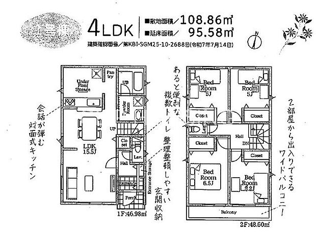 | 間取り | 4LDK 間取り内訳:リビングダイニングキッチン 15.5帖(1階)・洋室 6.5帖(2階)・洋室 5.2帖(2階)・洋室 5帖(2階)・洋室 5帖(2階) |