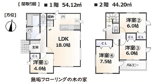 | 間取り | 4LDK 間取り内訳:リビングダイニングキッチン 18帖(1階)・洋室 4.6帖(1階)・洋室 7.5帖(2階)・洋室 6帖(2階)x2 |