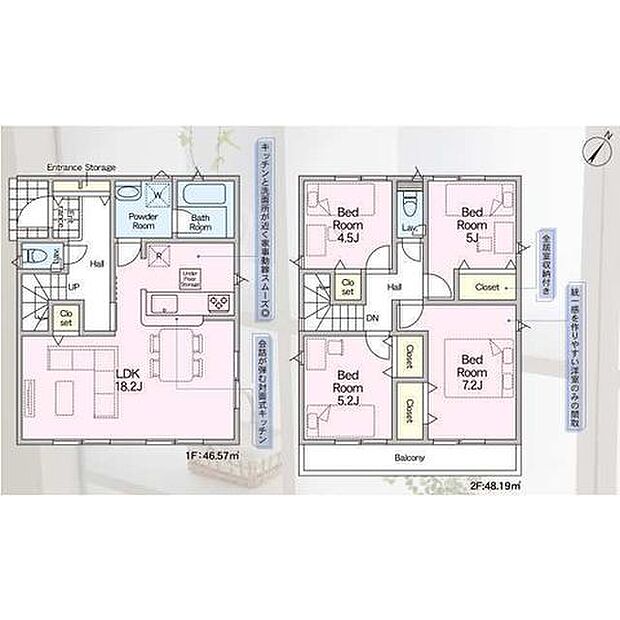 | 間取り | 4LDK 間取り内訳:リビングダイニングキッチン 18.2帖(1階)・洋室 7.2帖(2階)・洋室 5.2帖(2階)・洋室 5帖(2階)・洋室 4.5帖(2階) |