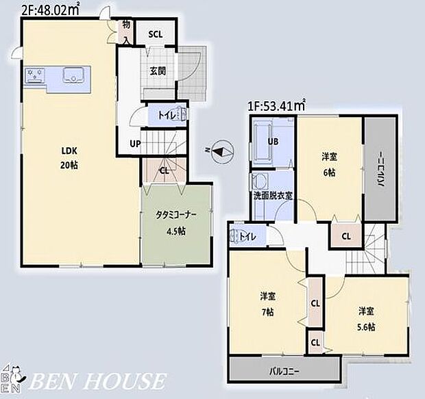 間取り内訳:リビングダイニングキッチン 20帖(1階)・洋室 6帖(2階)・洋室 5.6帖(2階)・和室 4.5畳(1階)・洋室 7帖(2階)