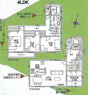 | 間取り | 4LDK 間取り内訳:リビングダイニングキッチン 17.5帖(1階)・和室 4.5畳(1階)・洋室 6.5帖(2階)・洋室 6帖(2階)x2 |