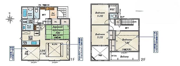 | 間取り | 4LDK 間取り内訳:リビングダイニングキッチン 17帖(1階)・和室 5畳(1階)・洋室 7帖(2階)・洋室 5.2帖(2階)x2 |