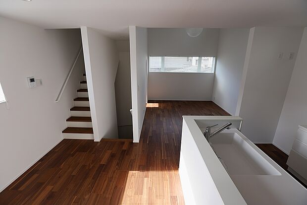 周辺には「若久公園」や「野間大池公園」があり、自然を感じながらの散歩やジョギング、家族でのピクニックが楽しめます。また、幼稚園や保育園も多く、共働き家庭や子育て世代にも優しいエリアです。<2階から3階に広がる吹抜け。ほどよい家族の距離感と開放的な空間に。>若久1丁目コンセプトハウスの敷地面積は20坪ほど。ですが、室内入ればそれを感じさせない空間の広がりがあります。その広がりをもたせてくれている吹抜けは、2階のリビングから3階の個室へとつながっています。吹抜けがあることで、それぞれが別のことをしていても家族の気配を感じられる空間にしてくれます。