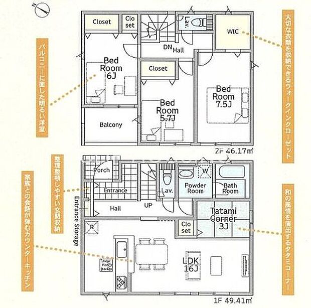 | 間取り | 3LDK 間取り内訳:リビングダイニングキッチン 16帖(1階)・和室 3畳(1階)・洋室 7.5帖(2階)・洋室 6帖(2階)・洋室 5.7帖(2階) |