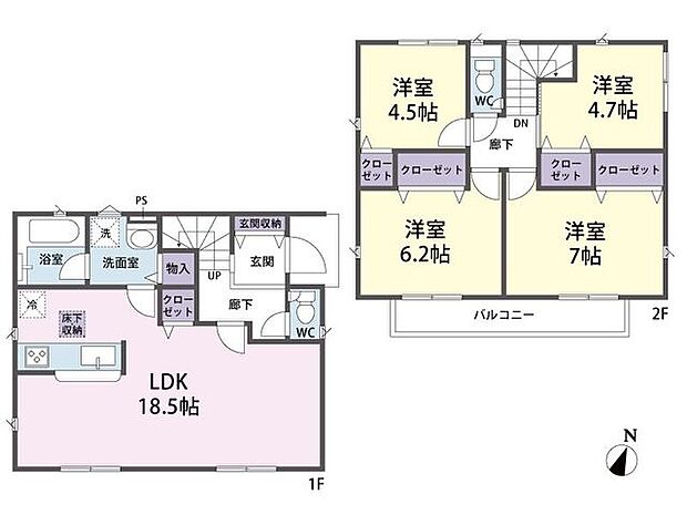 | 間取り | 4LDK 間取り内訳:リビングダイニングキッチン 18.5帖(1階)・洋室 7帖(2階)・洋室 6.2帖(2階)・洋室 4.7帖(2階)・洋室 4.5帖(2階) |