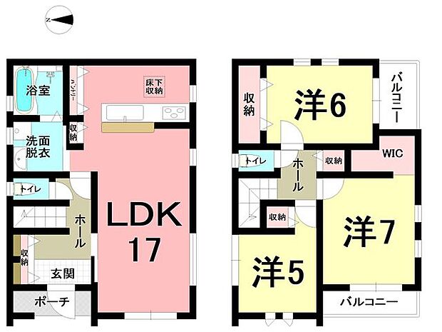 | 間取り | 3LDK 間取り内訳:リビングダイニングキッチン 17帖(1階)・洋室 5帖(2階)・洋室 7帖(2階)・洋室 6帖(2階) |