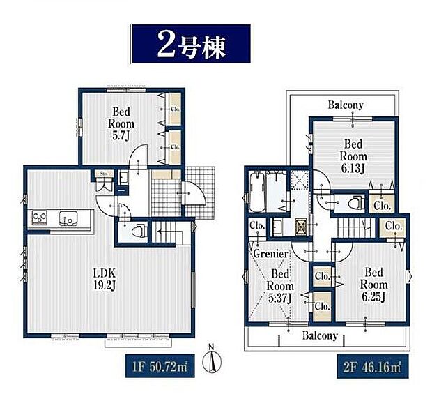 | 間取り | 4LDK 間取り内訳:リビングダイニングキッチン 19.2帖(1階)・洋室 5.7帖(1階)・洋室 6.2帖(2階)・洋室 6.1帖(2階)・洋室 5.3帖(2階) |