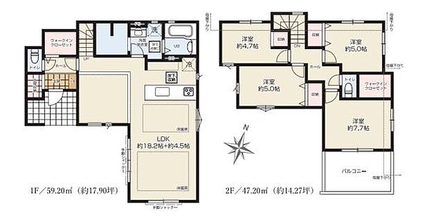 | 間取り | 4LDK 間取り内訳:リビングダイニングキッチン 22.7帖(1階)・洋室 7.7帖(2階)・洋室 5帖(2階)・洋室 5帖(2階)・洋室 4.7帖(2階) |