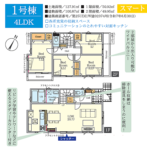 | 間取り | 4LDK 間取り内訳:リビングダイニングキッチン 20.7帖(1階)・洋室 7.5帖(2階)・洋室 5.2帖(2階)・洋室 5帖(2階)・洋室 4.5帖(2階) |