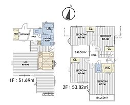 間取り内訳:リビングダイニングキッチン 18帖(1階)・洋室 7.4帖(2階)・洋室 6.5帖(2階)・洋室 5.3帖(2階)・洋室 5.2帖(2階)