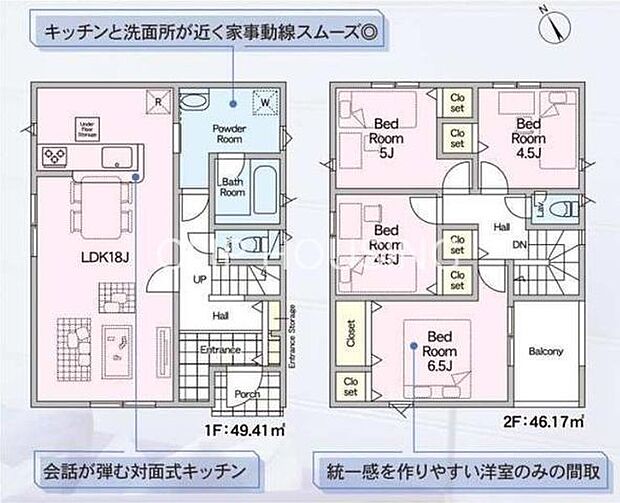 | 間取り | 4LDK 間取り内訳:リビングダイニングキッチン 18帖(1階)・洋室 4.5帖(2階)・洋室 4.5帖(2階)・洋室 5帖(2階)・洋室 6.5帖(2階) |