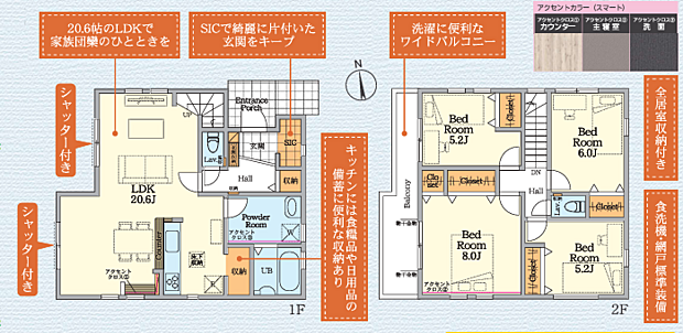 | 間取り | 4LDK 間取り内訳:リビングダイニングキッチン 20.6帖(1階)・洋室 8帖(2階)・洋室 6帖(2階)・洋室 5.2帖(2階)x2 |