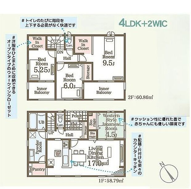 間取り内訳:リビングダイニングキッチン 17帖(1階)・和室 4.5畳(1階)・洋室 9.5帖(2階)・洋室 6帖(2階)・洋室 5.2帖(2階)