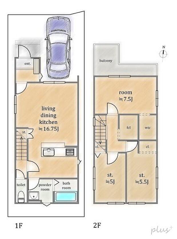 | 間取り | 1SLDK(+S) 間取り内訳:リビングダイニングキッチン 16.7帖(1階)・洋室 7.5帖(2階)・収納 5.5帖(2階)・収納 5帖(2階) |