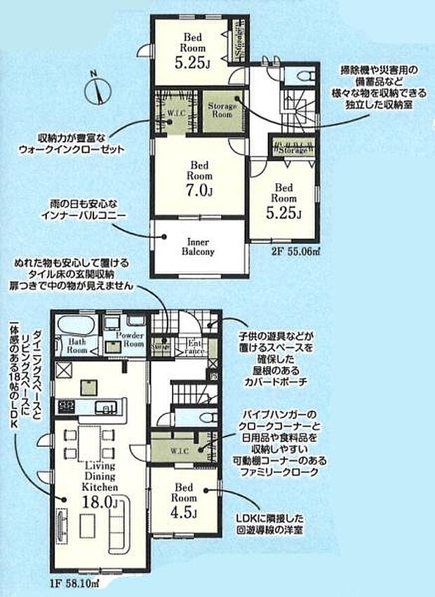 | 間取り | 4SLDK 間取り内訳:リビングダイニングキッチン 18帖(1階)・洋室 4.5帖(1階)・洋室 7帖(2階)・洋室 5.2帖(2階)・洋室 5.2帖(2階)・収納 2帖(2階) |