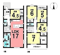 | 間取り | 5LDK 間取り内訳:洋室 5帖(2階)・洋室 4.5帖(2階)・リビングダイニングキッチン 17帖(1階)・洋室 4.5帖(1階)・洋室 7帖(2階)・洋室 6帖(2階) |