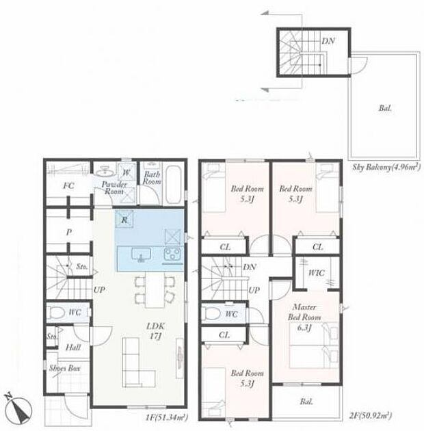 家族が集まるLDKは約17帖の大空間! 広々としたペニンシュラタイプキッチンを採用! カースペース並列2台分完備! スカイバルコニー付き!