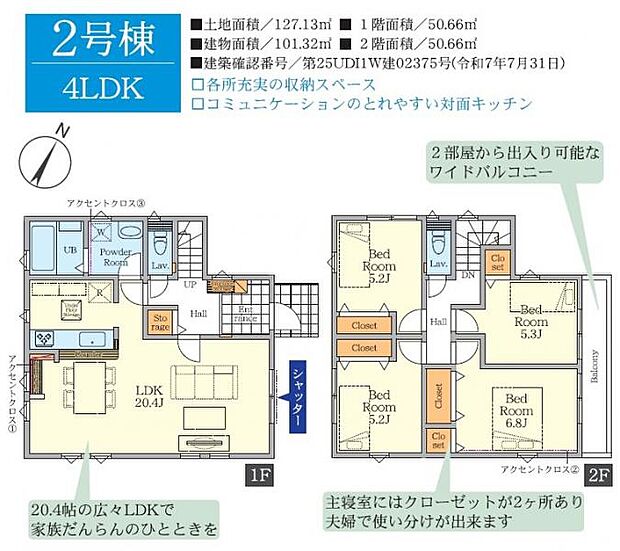 | 間取り | 4LDK 間取り内訳:リビングダイニングキッチン 20.4帖(1階)・洋室 6.8帖(2階)・洋室 5.3帖(2階)・洋室 5.2帖(2階)x2 |