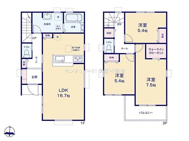 | 間取り | 3LDK 間取り内訳:リビングダイニングキッチン 16.7帖(1階)・洋室 7.5帖(2階)・洋室 5.4帖(2階)・洋室 5.4帖(2階) |