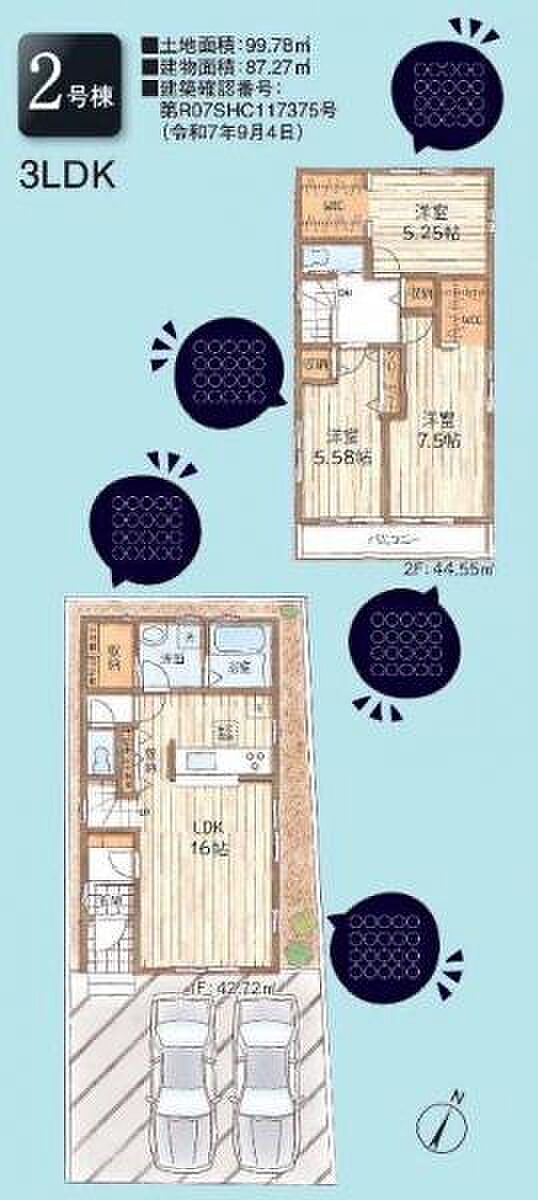 間取り内訳:リビングダイニングキッチン 16帖(1階)・洋室 7.5帖(2階)・洋室 5.5帖(2階)・洋室 5.2帖(2階)