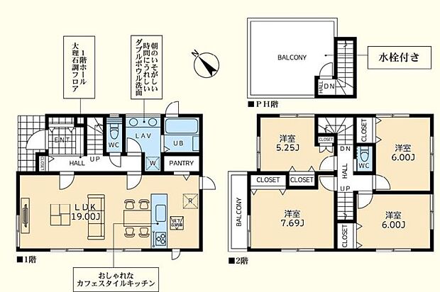 | 間取り | 4LDK 間取り内訳:リビングダイニングキッチン 19帖(1階)・洋室 7.6帖(2階)・洋室 6帖(2階)x2・洋室 5.2帖(2階) |