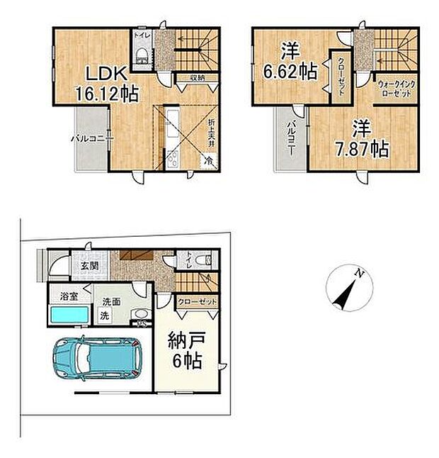 間取り内訳:収納 6帖(1階)・リビングダイニングキッチン 16.1帖(2階)・洋室 6.6帖(3階)・洋室 7.8帖(3階)