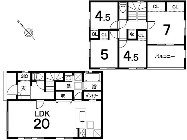 | 間取り | 4LDK 間取り内訳:リビングダイニングキッチン 20帖(1階)・洋室 7帖(2階)・洋室 5帖(2階)・洋室 4.5帖(2階)x2 |
