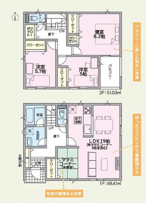 | 間取り | 3LDK 間取り内訳:リビングダイニングキッチン 19帖(1階)・洋室 5帖(2階)・洋室 5.7帖(2階)・洋室 8.2帖(2階) |