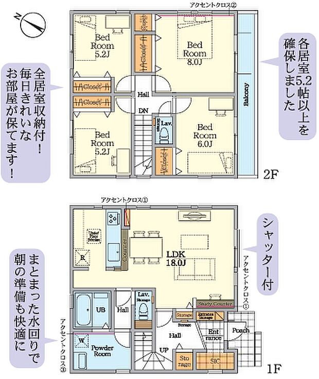 | 間取り | 4LDK 間取り内訳:洋室 6帖(2階)・洋室 5.2帖(2階)x2・リビングダイニングキッチン 18帖(1階)・洋室 8帖(2階) |