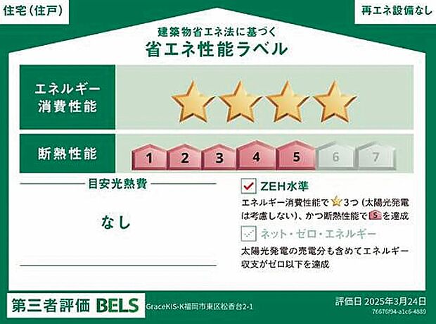 - 星マークの数が多いほどエネルギー消費性能が高いことを示しています。再エネ設備のない住宅は★0~★4の5段階評価、再エネ設備がある住宅は★0~★6の7段階評価となります。