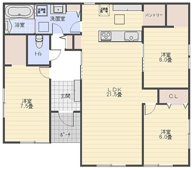 | 間取り | 3LDK 間取り内訳:リビングダイニングキッチン 21.5帖(1階)・洋室 7.5帖(1階)・洋室 6帖(1階)・洋室 6帖(1階) |