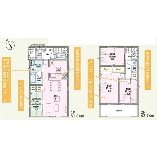 | 間取り | 4LDK 間取り内訳:リビングダイニングキッチン 18帖(1階)・和室 4畳(1階)・洋室 8帖(2階)・洋室 6帖(2階)・洋室 6帖(2階) |