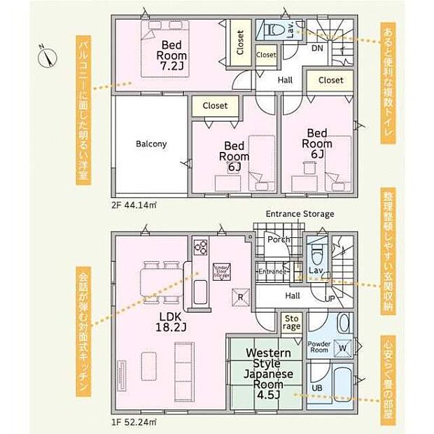 | 間取り | 4LDK 間取り内訳:リビングダイニングキッチン 18.2帖(1階)・和室 4.5畳(1階)・洋室 7.2帖(2階)・洋室 6帖(2階)・洋室 6帖(2階) |