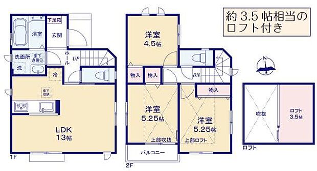 | 間取り | 3LDK 間取り内訳:リビングダイニングキッチン 13帖(1階)・洋室 5.2帖(2階)・洋室 5.2帖(2階)・洋室 4.5帖(2階) |