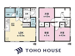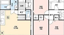 | 間取り | 3SLDK 間取り内訳:リビングダイニングキッチン 12.5帖(1階)・洋室 5帖(2階)・洋室 4.5帖(2階)・洋室 4.5帖(2階)・収納(2階) |