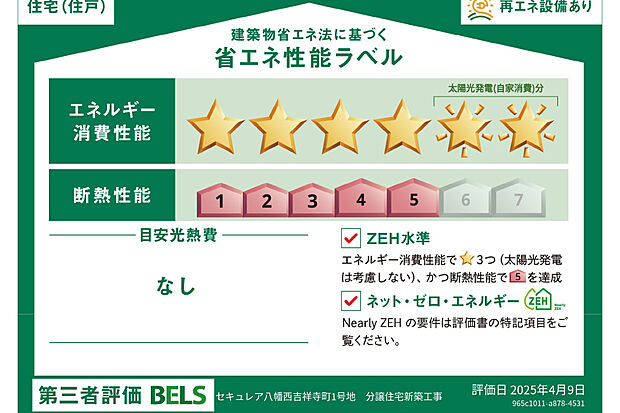 - 星マークの数が多いほどエネルギー消費性能が高いことを示しています。再エネ設備のない住宅は★0~★4の5段階評価、再エネ設備がある住宅は★0~★6の7段階評価となります。