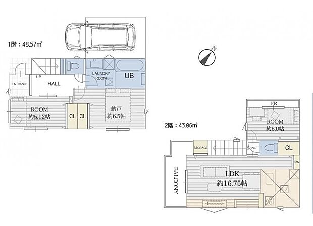 間取り内訳:洋室 5.1帖(1階)・収納 6.5帖(1階)・リビングダイニングキッチン(2階)・洋室 5帖(2階)